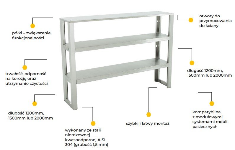 Atuty nadstawki do stołu roboczego Półki – zwiększenie funkcjonalności Trwałość, odporność na korozję oraz utrzymanie czystości Długość 1200 mm, 1500 mm lub 2000 mm Wykonany ze stali nierdzewnej kwasoodpornej AISI 304 (grubość 1,5 mm) Szybki i łatwy montaż Otwory do przymocowania do ściany Kompatybilna z modułowymi systemami mebli pasiecznych |
