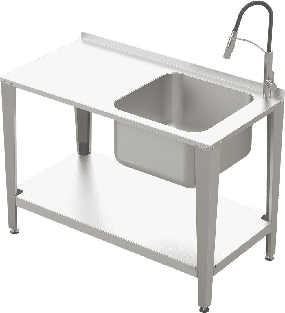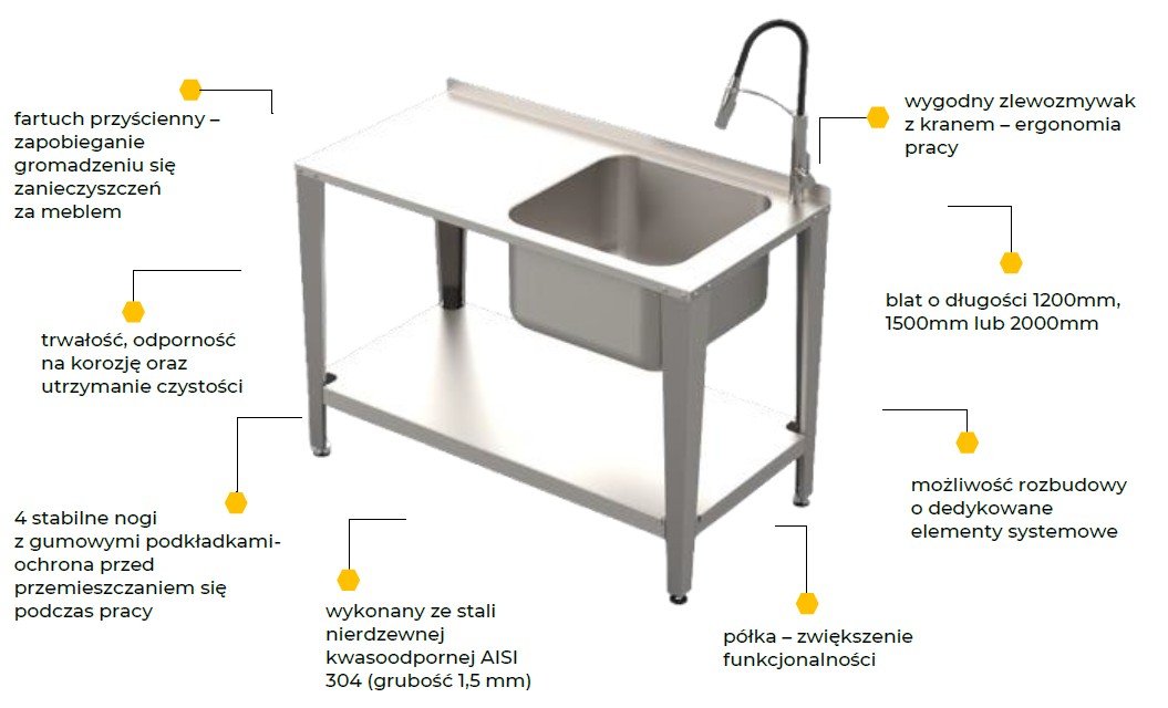 Atuty stołu roboczego Wykonany z wysokogatunkowej stali nierdzewnej kwasoodpornej AISI 304 (1,5 mm) – odporność na korozję, kwasy organiczne i wilgoć Wygodny zlewozmywak z kranem – szybki dostęp do wody bez opuszczania stanowiska Gładkie powierzchnie i estetyczne spawy – łatwe utrzymanie higieny Fartuch przyścienny – ochrona ściany przed zabrudzeniem Półka dolna – dodatkowa przestrzeń na narzędzia i akcesoria Stabilna konstrukcja z nogami wyposażonymi w gumowe podkładki – zapobieganie przesuwaniu się podczas pracy Szybki montaż bez specjalistycznych narzędzi Możliwość rozbudowy o dedykowane elementy systemowe |