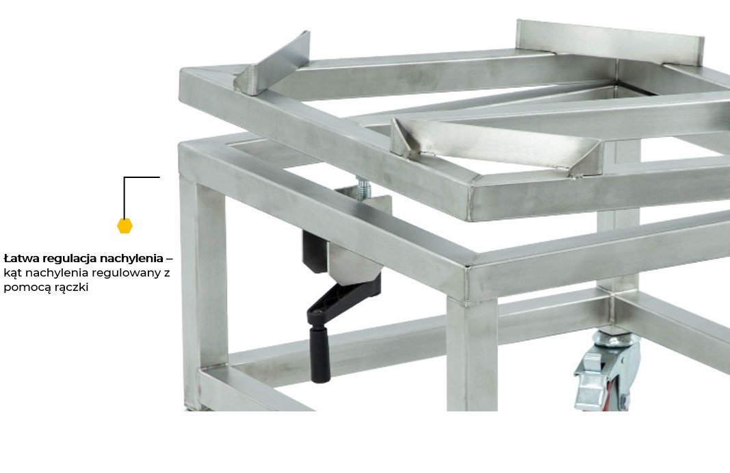 Wózek transportowy do odstojników/urządzeń do kremowania 50 l, 70 l (bez płaszcza grzewczego), regulowany Kompaktowy wózek transportowy przeznaczony do wygodnego i bezpiecznego przemieszczania odstojników oraz urządzeń do kremowania miodu o pojemnościach 50 i 70 litrów, niewyposażonych w płaszcz grzewczy. Wykonany ze stali nierdzewnej, odporny na korozję i intensywną eksploatację. Obrotowe kółka z hamulcami zapewniają stabilność oraz pełną kontrolę podczas transportu. Platforma wózka posiada możliwość regulacji kąta nachylenia do 3%, realizowaną za pomocą śruby regulacyjnej z precyzyjnym gwintem. Funkcja ta ułatwia opróżnianie zbiorników w sposób bezpieczny i kontrolowany. |